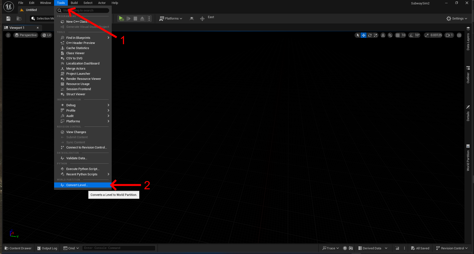 After creating and naming your level, it must be converted into a World Partition level.